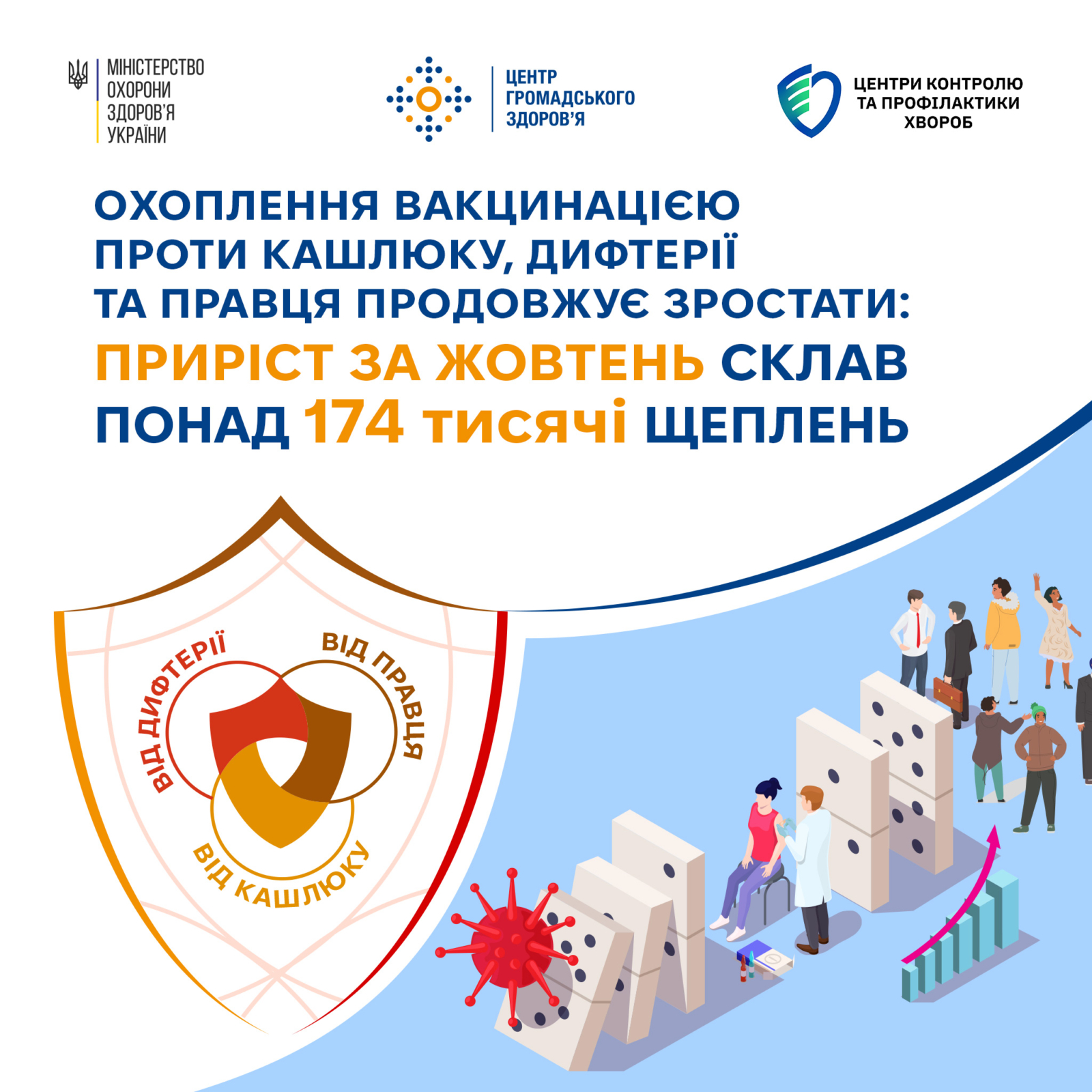 Як і в попередні місяці, проведення кампанії зберігає позитивну динаміку. У жовтні 641 269 людей отримали щеплення в межах ДЗІ проти 467 037 у вересні. Таким чином, приріст становив 174 232 щеплення. Дітям віком від 1 до 6 років проведено 92 583 щеплення проти кашлюку, дифтерії та правця; дітям віком 7–17 років — 89 680 щеплень проти дифтерії та правця; дорослим зроблено 450 032 щеплення.