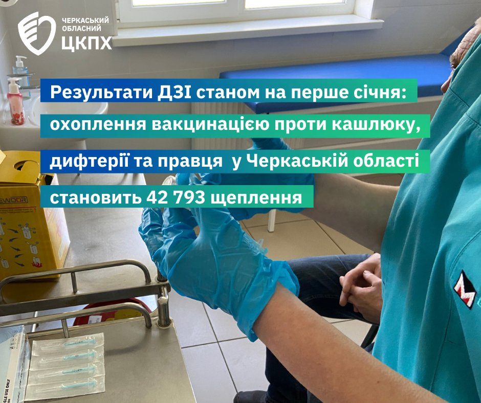 Як і в попередні місяці, проведення кампанії зберігає позитивну динаміку. Показники по Черкаській області, у межах проведення додаткових заходів з імунізації населення проти кашлюку, дифтерії та правця станом на перше січня проведено 42 793 щеплення.