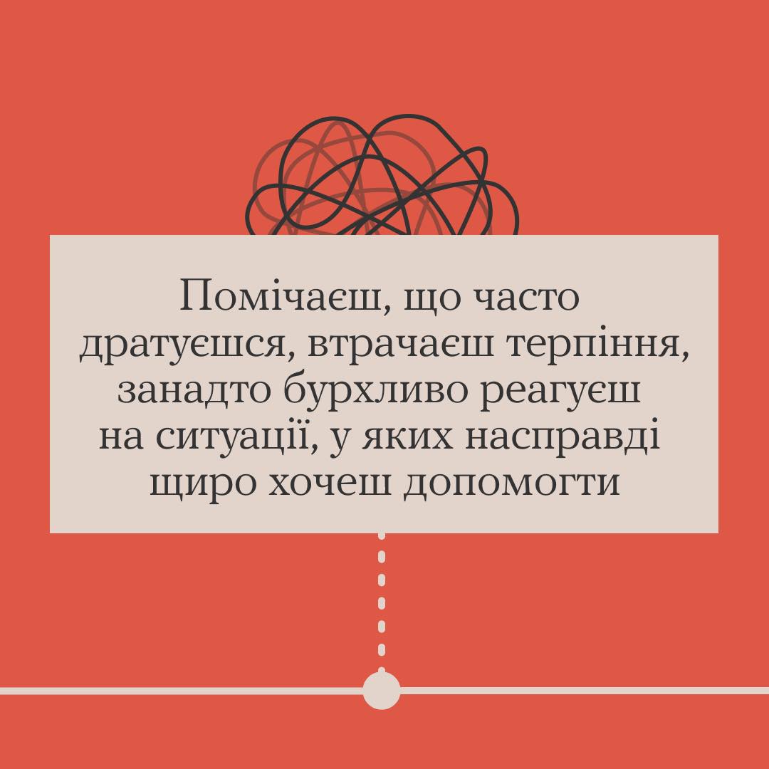 Пропонуємо тобі поставити собі такі запитання, щоб вчасно зробити паузу. Спокійно вдихнути, видихнути. Проаналізувати свій поточний стан і за необхідності — знайти підтримку.