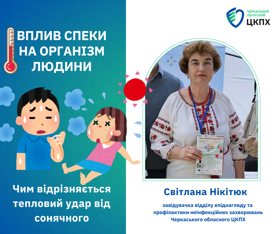 Як розпізнати тепловий та сонячний удари та як від них уберегтися – про це у програмі «Радіодень» на Українському радіо Черкаси розповіла завідувачка відділу епіднагляду та профілактики неінфекційних захворювань Черкаського обласного центру контролю та профілактики хвороб МОЗ України Світлана Нікітюк.
