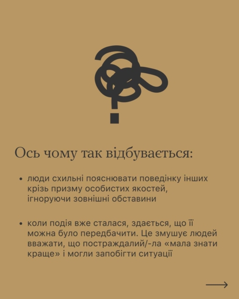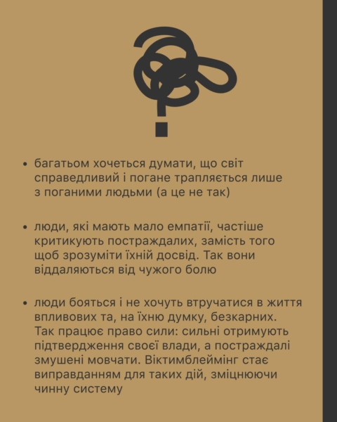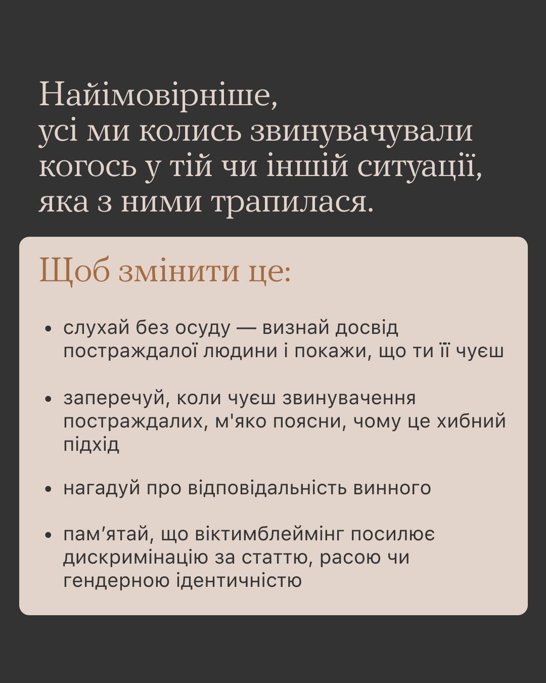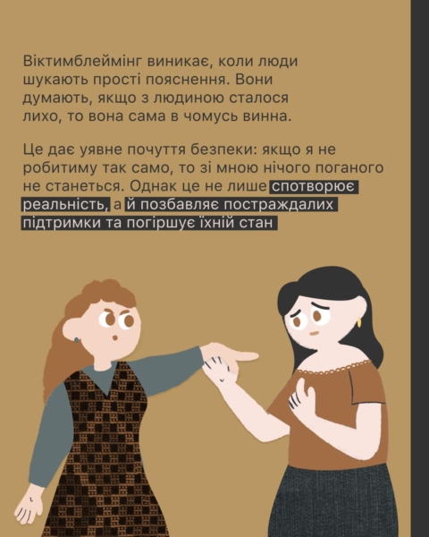Коли тебе звинувачують, хоча постраждав/-ла саме ти, це може бути неймовірно болісно. Це явище має назву віктимблеймінг. Розповідаємо про його причини в каруселі, аби точно знати, з чим ми маємо справу. А ще обіймаємо. На випадок, якщо через останні новини ти почуваєшся так собі.