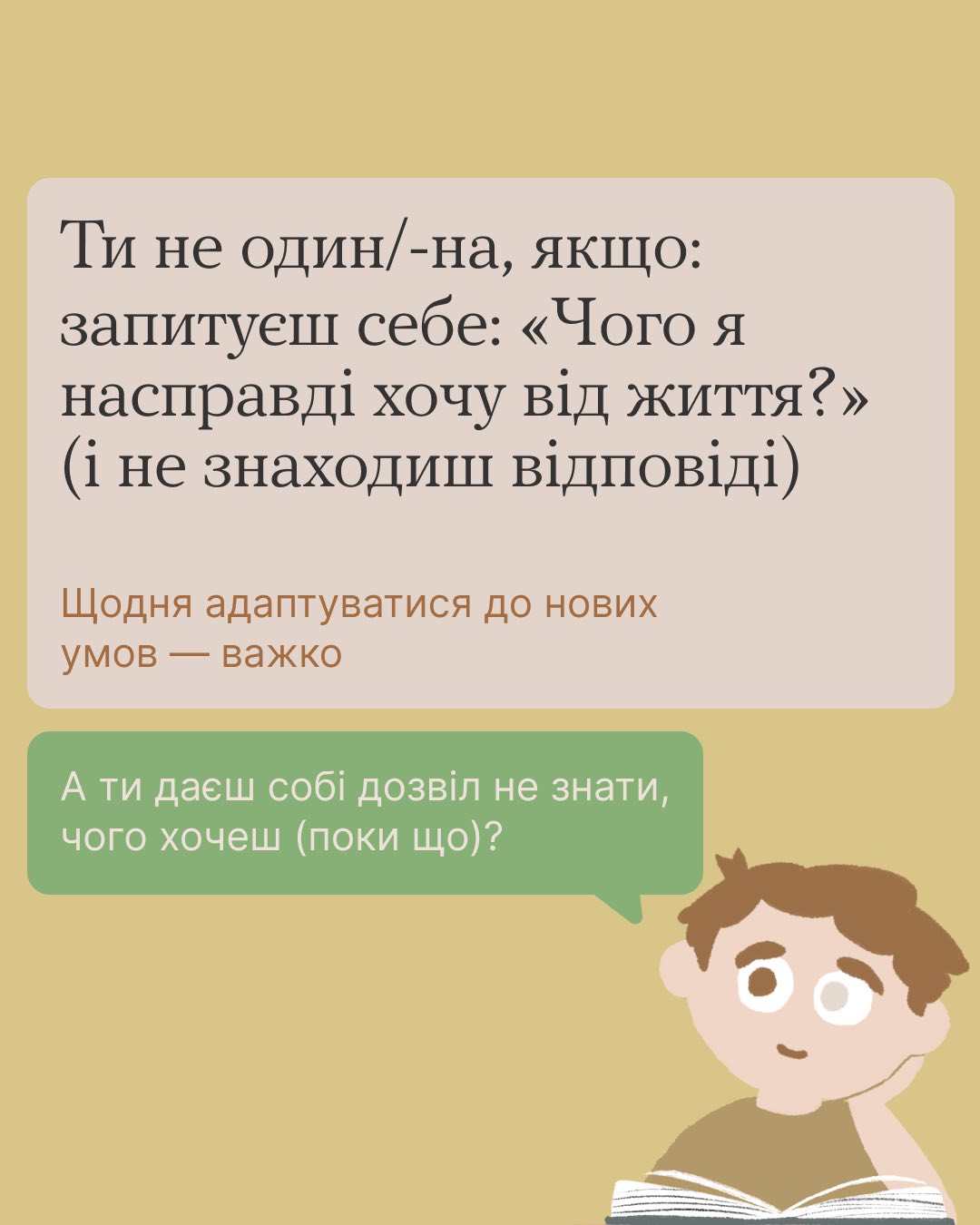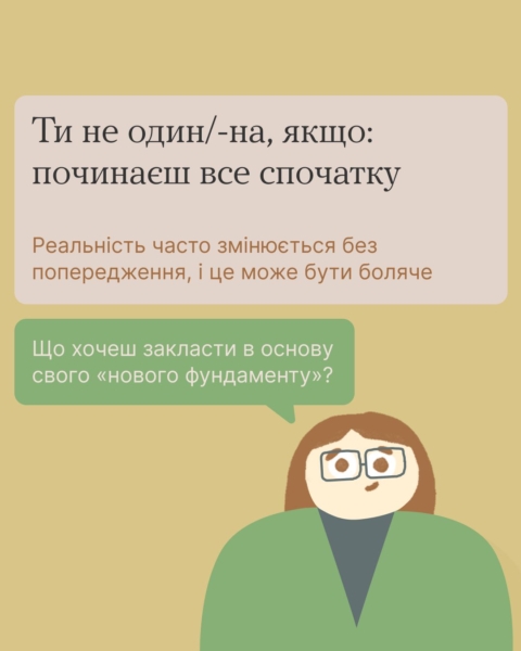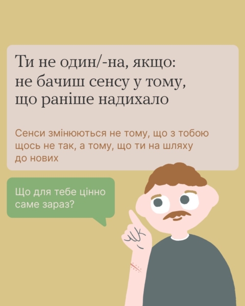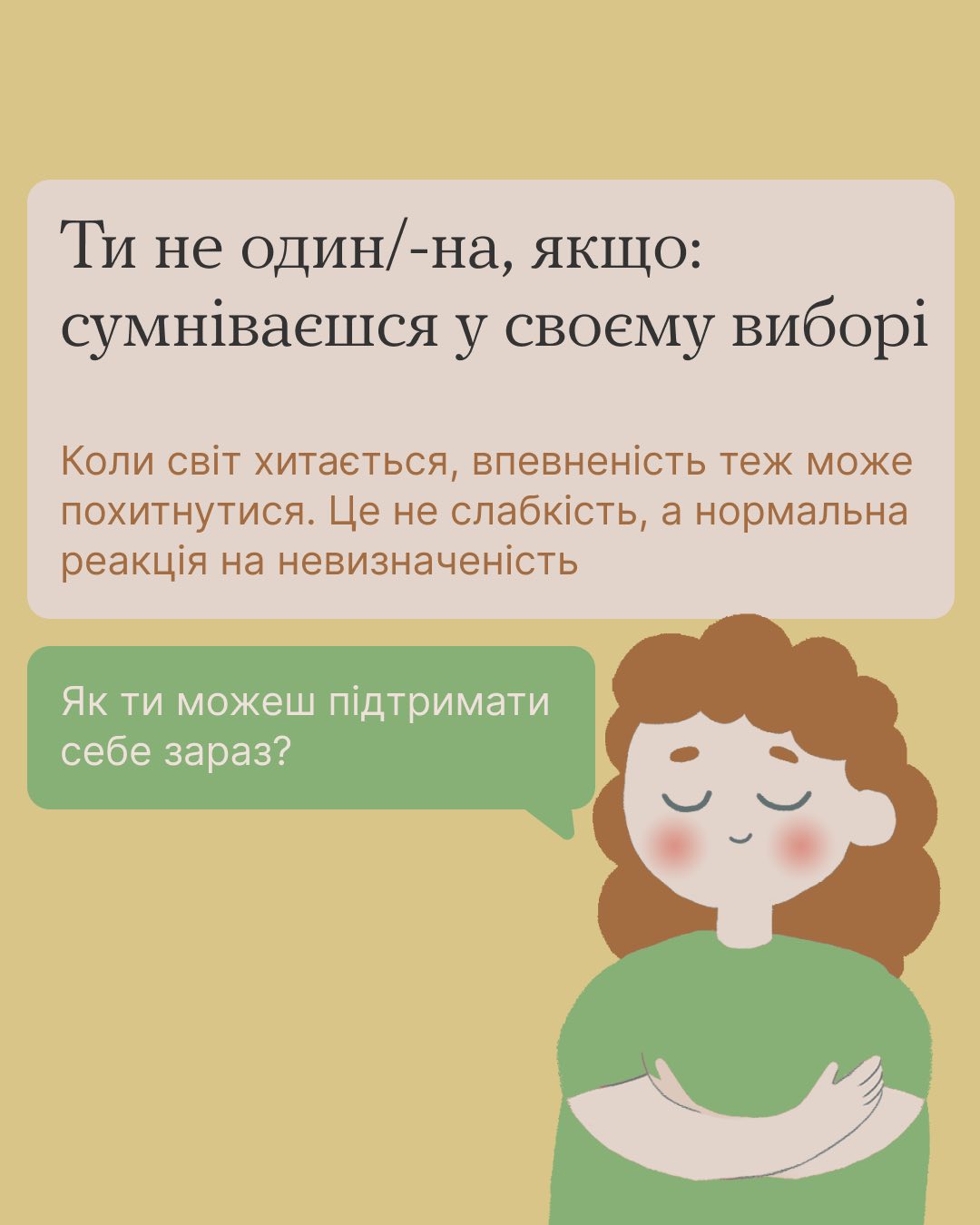 У часи війни не завжди є сили, відповіді чи розуміння, куди йти далі. Це не про слабкість, це про досвід життя в щоденній нестабільності, що об’єднує мільйони українців. Пам’ятай: ти не один/-на у своїй розгубленості.