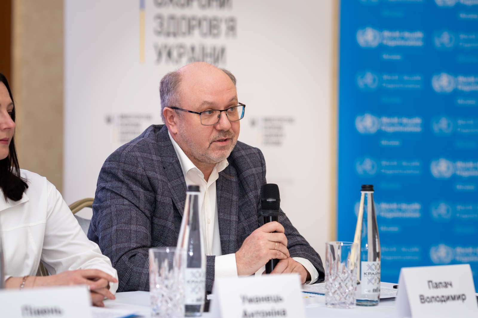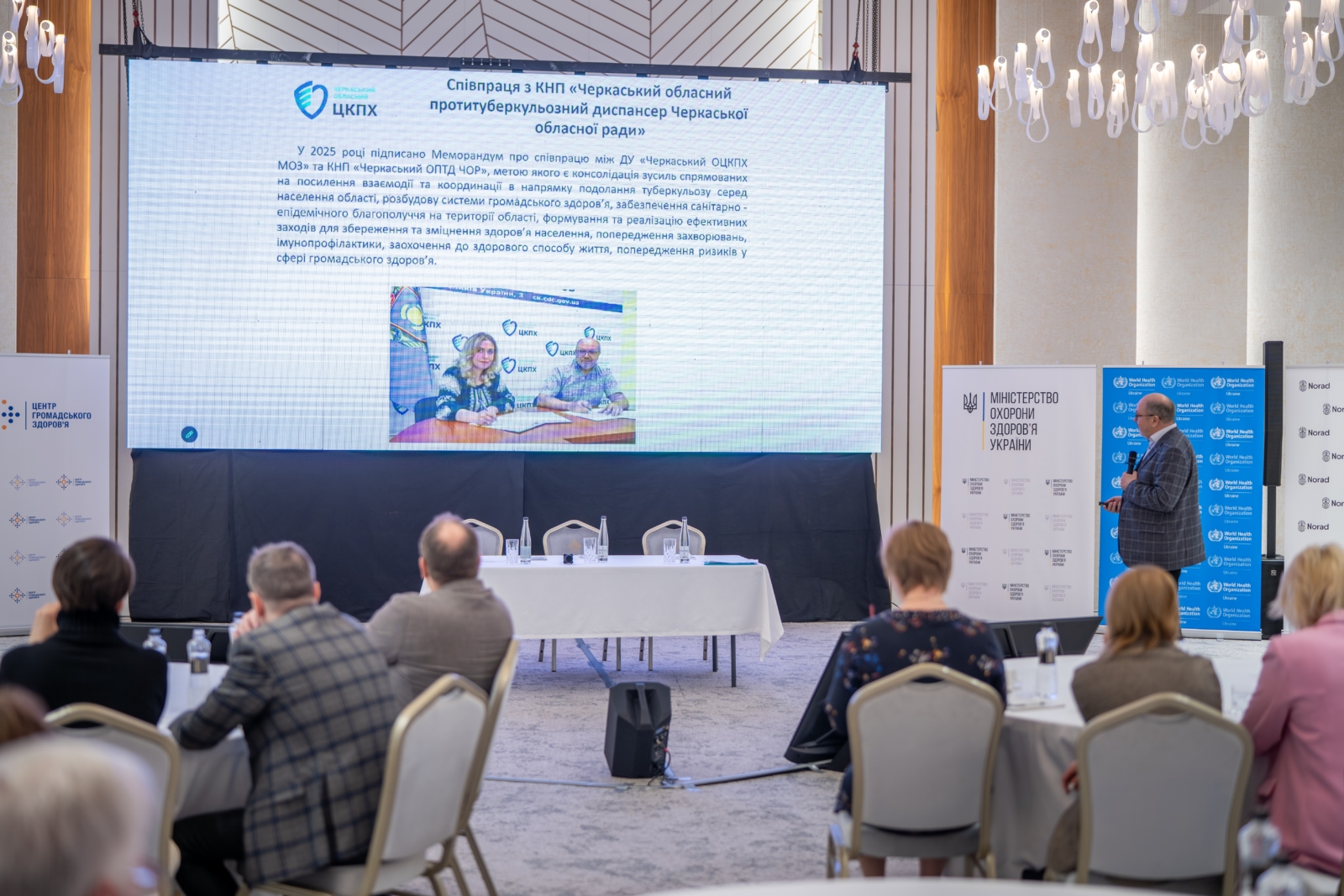 Володимир Папач, генеральний директор Черкаського обласного ЦКПХ, головний державний санітарний лікар області, доповів про трансформацію та зміцнення спроможності Центру, а також поділився досвідом організації заходів з протидії туберкульозу в області.