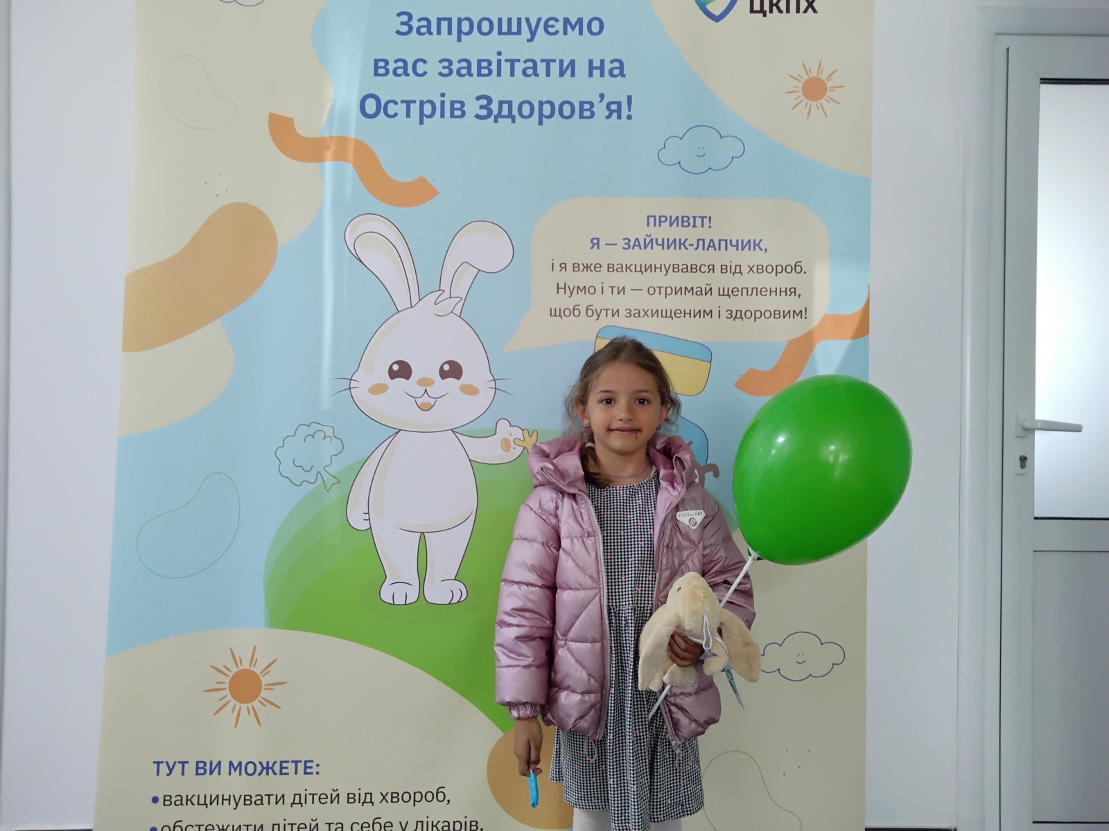На облаштованих острівцях здоров’я діти фотографувалися з героями вакцинальної акції Зайчиком-Лапчиком та Вакцинкою, розмальовували їх зображення, гралися з медичним набором та отримували подарунки – брендовані кульки, іграшки Зайчик-Лапчик і термокружки зі слоганом «Я вакцинований – я захищений».