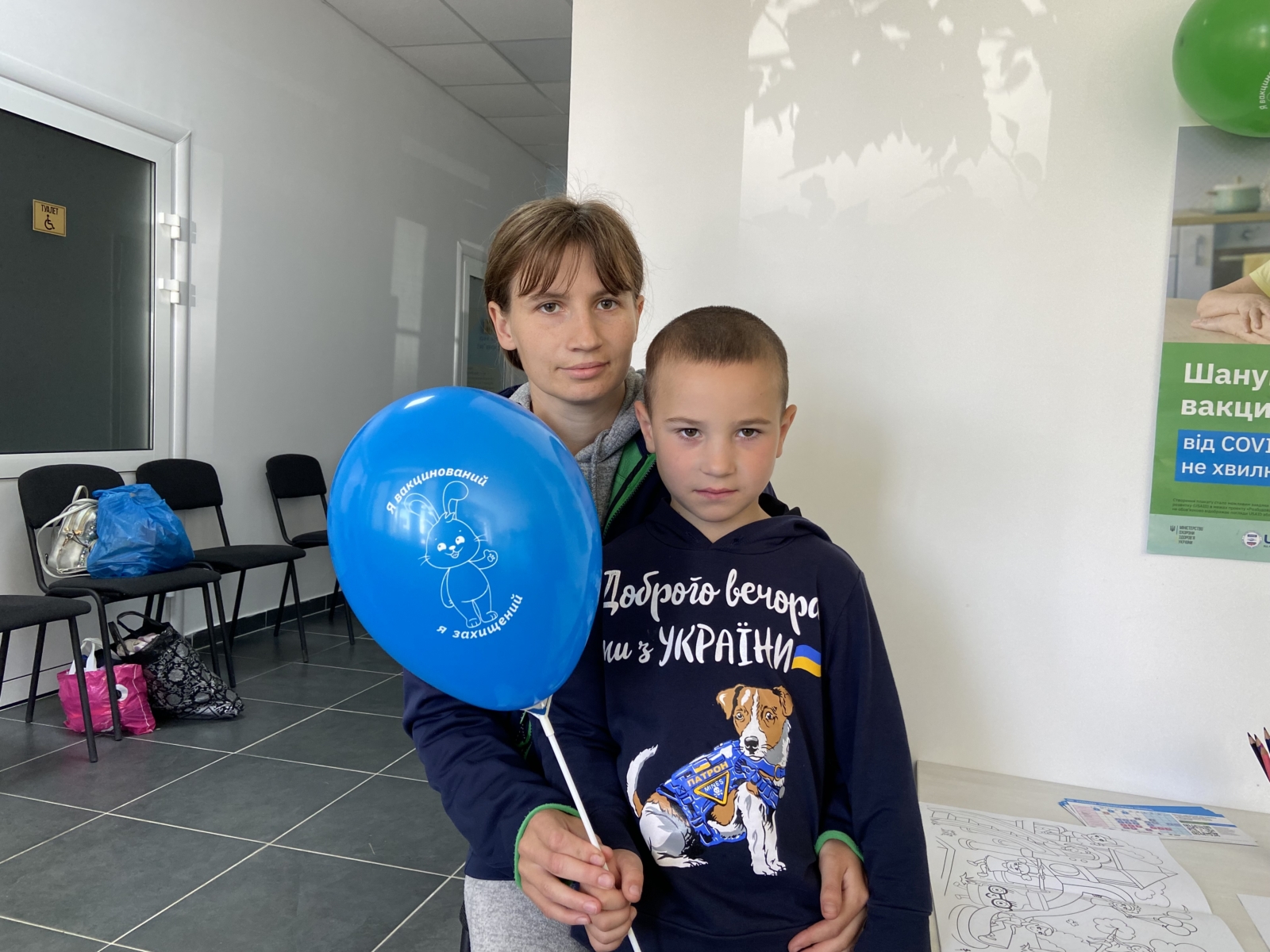 На захід приходили і родини, які через війну вимушено покинули свій дім. Однією з них була Галина, вона разом із дітьми переїхала до Черкаської області рік тому і попри все піклується про їхнє здоров’я. Доки шестирічний син Андрій грався з іншими дітьми на розважальних локаціях, мама спостерігала за сином та стояла в черзі на вакцинацію: