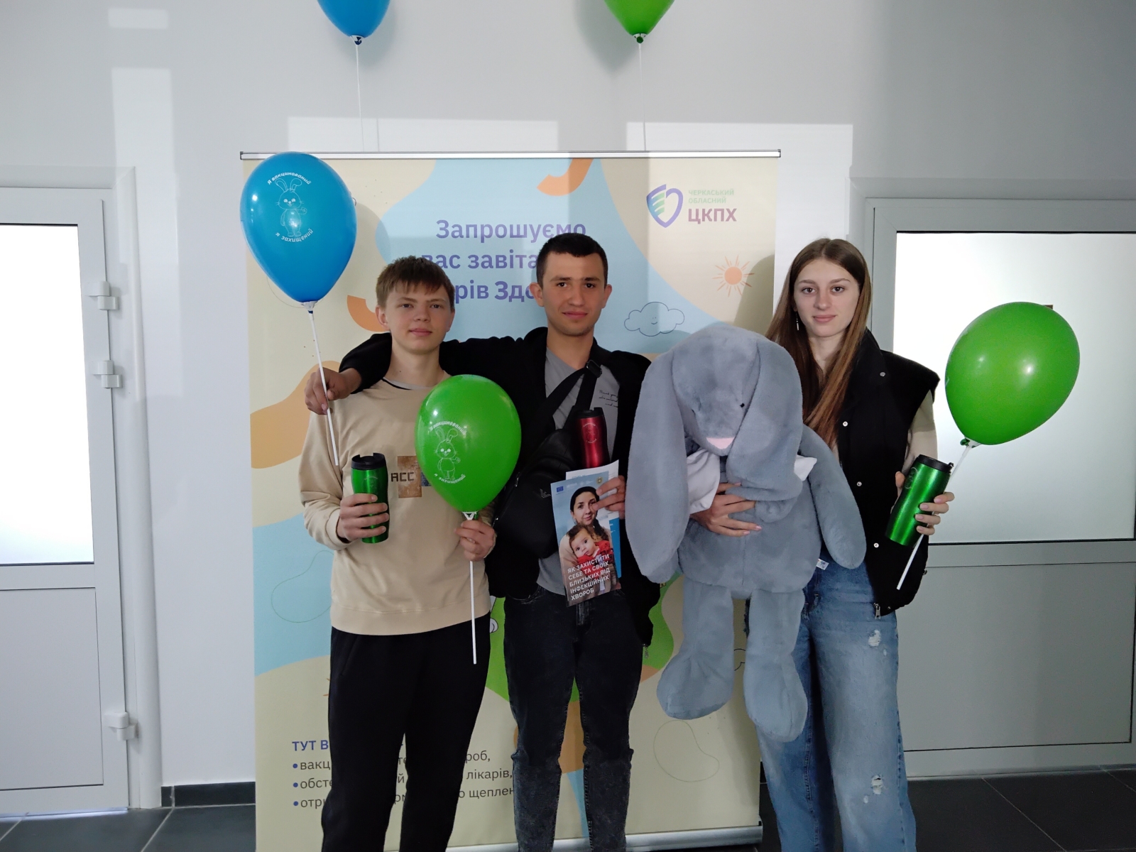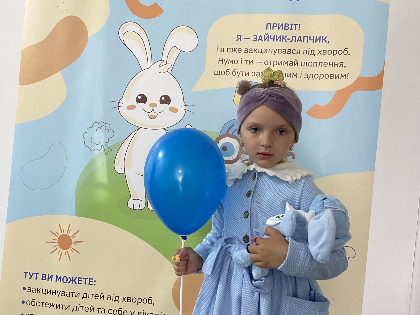 На облаштованих острівцях здоров’я діти фотографувалися з героями вакцинальної акції Зайчиком-Лапчиком та Вакцинкою, розмальовували їх зображення, гралися з медичним набором та отримували подарунки – брендовані кульки, іграшки Зайчик-Лапчик і термокружки зі слоганом «Я вакцинований – я захищений».