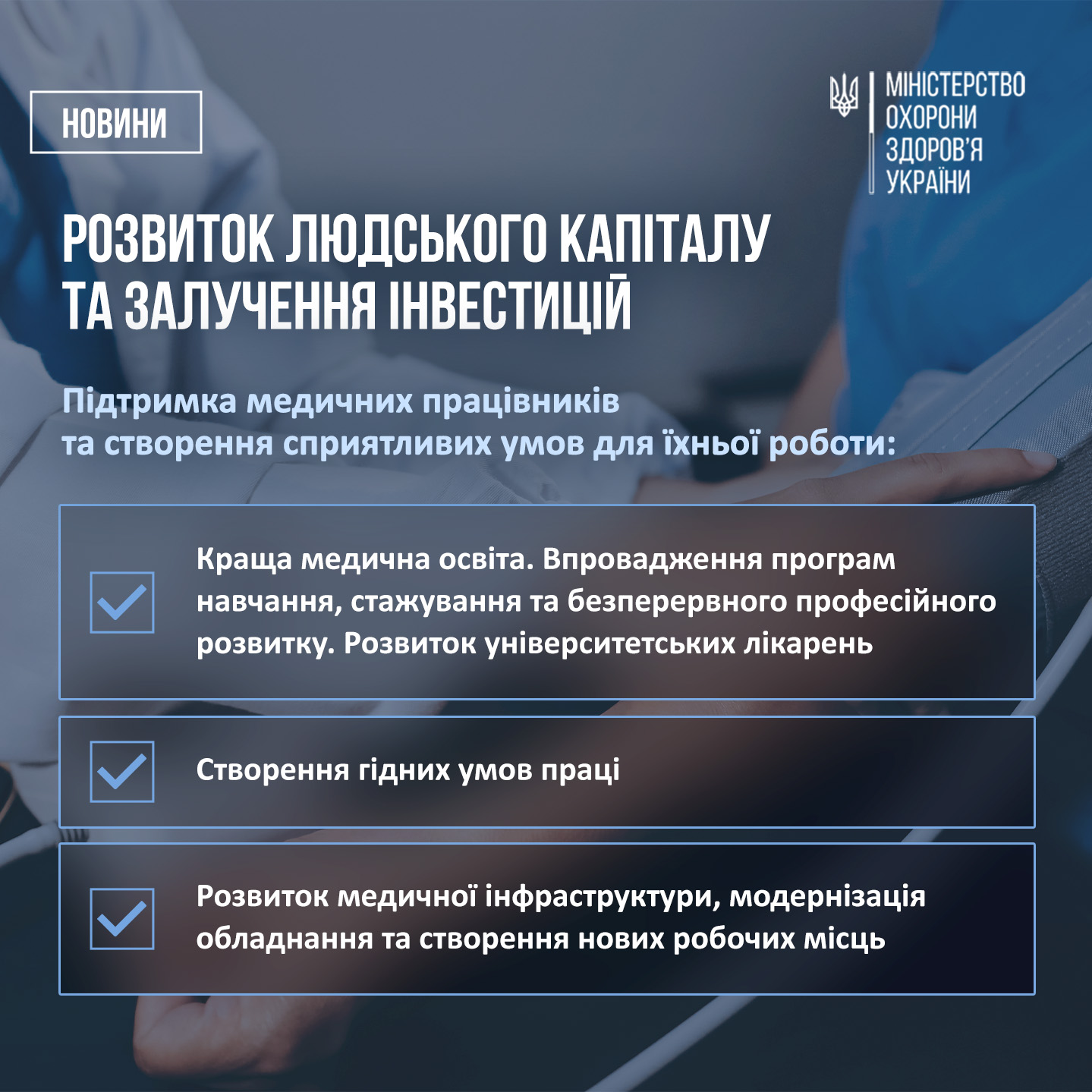 - Розвиток медичної інфраструктури, модернізація обладнання та створення нових робочих місць.