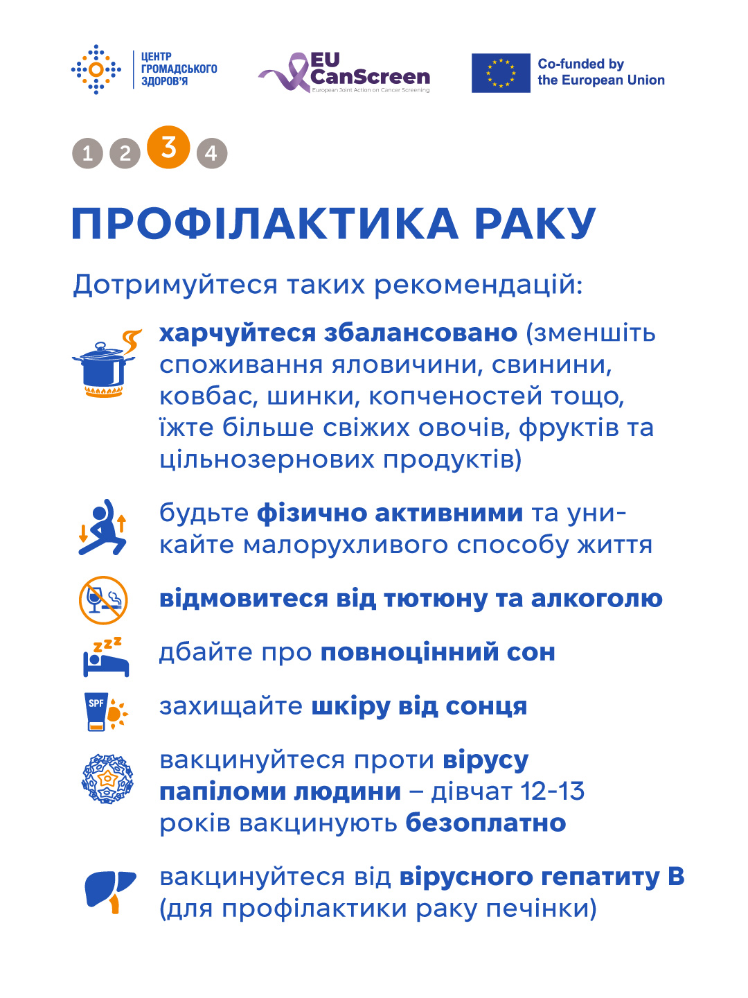Для зменшення впливу чинників, які сприяють розвитку онкологічних хвороб, дотримуйтеся таких рекомендацій: