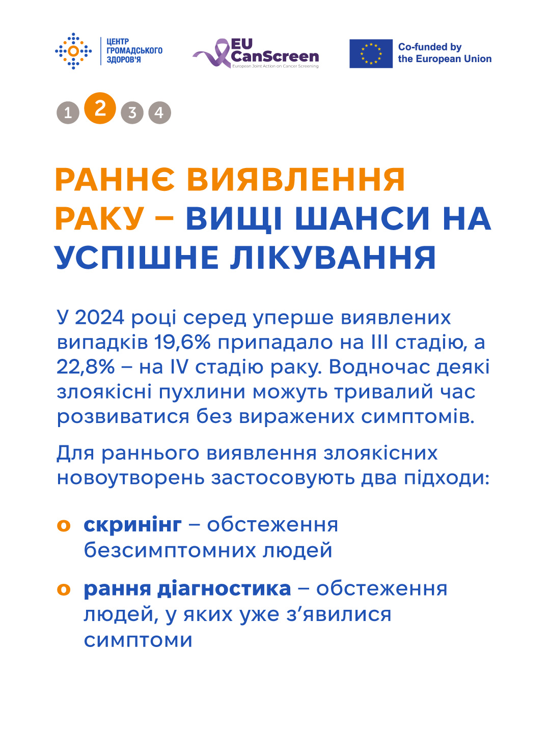 За оперативними даними Національного канцер-реєстру України, у 2024 році серед уперше виявлених випадків 19,6% припадало на III стадію, а 22,8% — на IV стадію онкологічної хвороби. Водночас деякі злоякісні пухлини можуть тривалий час розвиватися без виражених симптомів. Наприклад, рак підшлункової залози часто діагностують уже на пізніх стадіях, коли радикальне лікування є малоефективним.