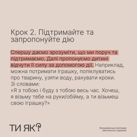 Тут знадобиться наша спокійна поведінка. Вона допоможе знизити тривогу у дитини і зберегти емоційний стан у нормі.