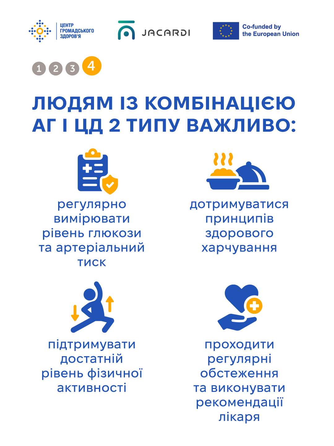 - дотримуватися принципів здорового харчування з обмеженням солі, цукру та насичених жирів;