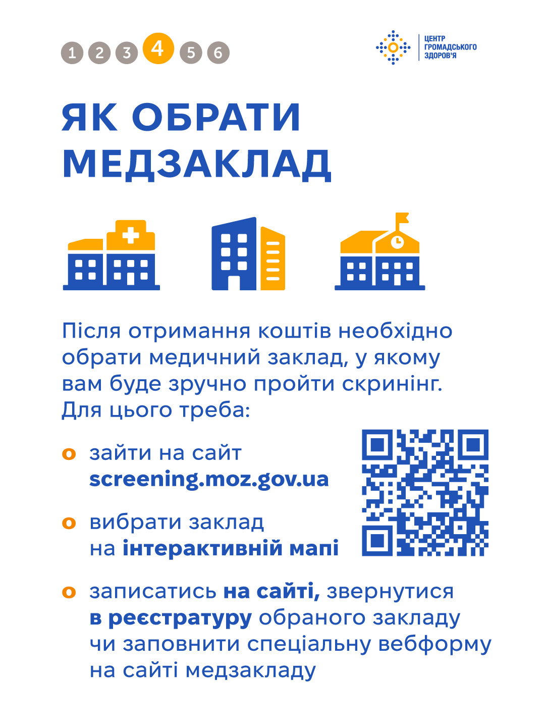 Після отримання коштів необхідно обрати медичний заклад (він може бути державний, комунальний або приватний), в якому вам буде зручно пройти скринінг. Для цього треба: