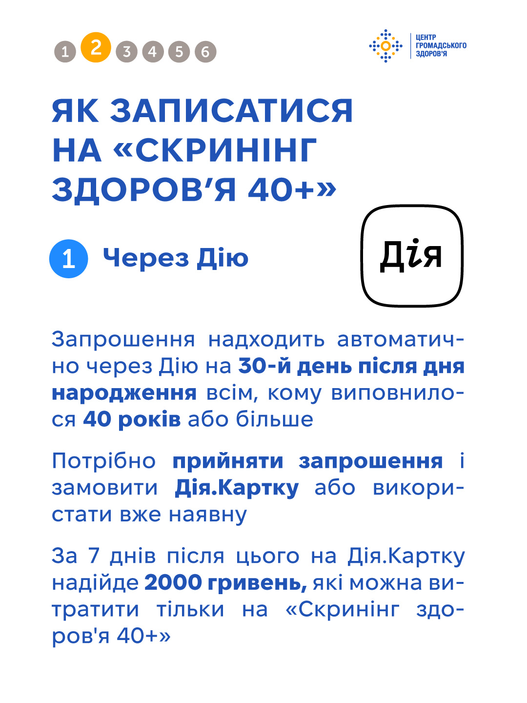 1. Запрошення пройти скринінг надходить автоматично через застосунок Дія— на 30-й день після дня народження всім людям, яким виповнилося 40 років або більше.