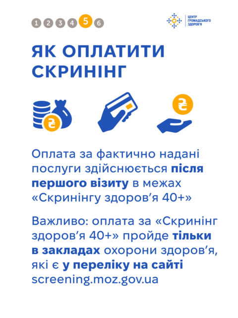 Оплата за фактично надані послуги здійснюється після першого візиту в межах «Скринінгу здоров’я 40+». Після оплати кошти будуть автоматично списані з Дія.Картки або пластикової картки зі спеціальним рахунком. Важливо: оплата за «Скринінг здоров’я 40+» пройде тільки в закладах охорони здоров’я, які є у визначеному переліку, згаданому вище.
