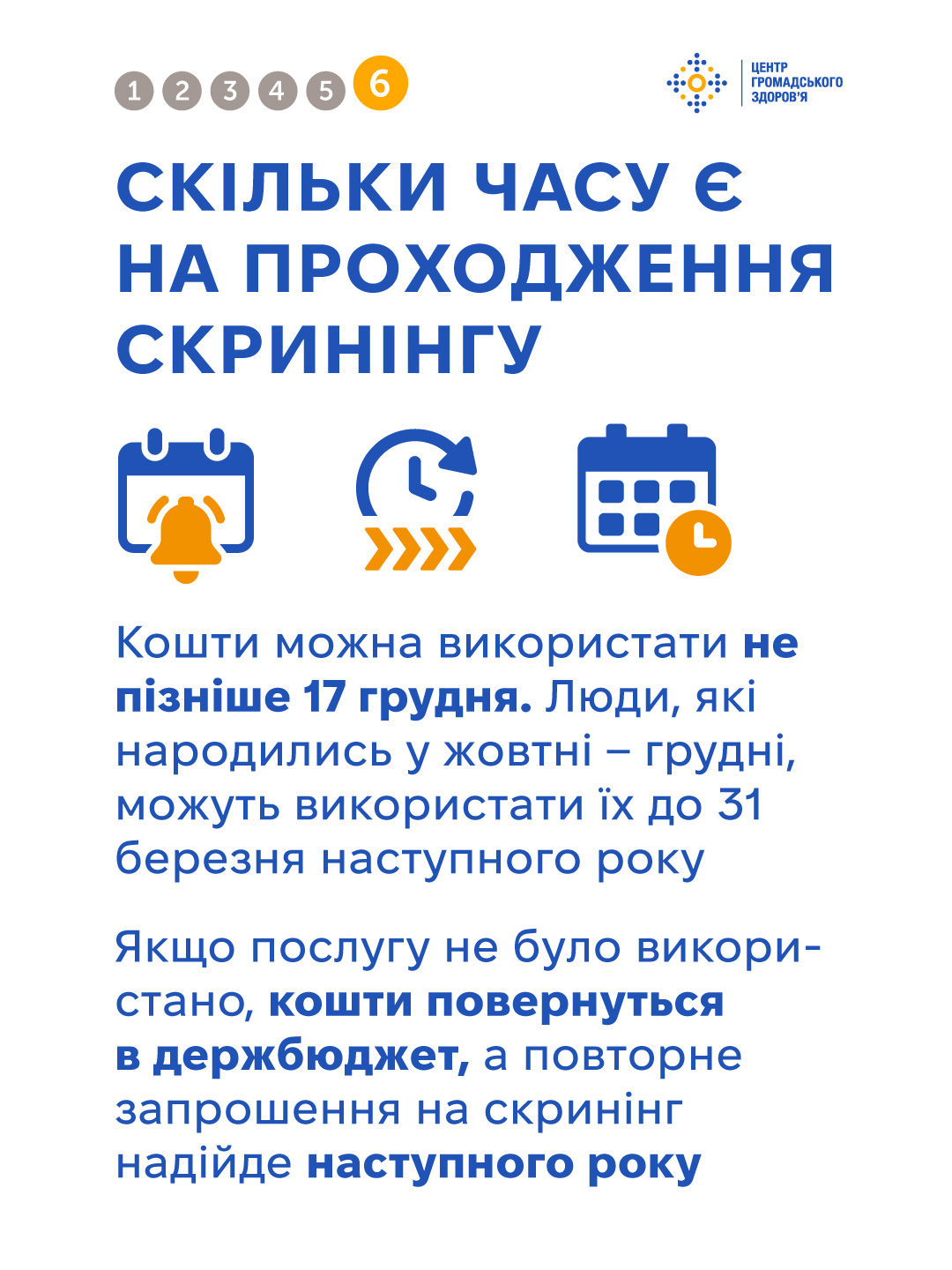 Отримані кошти можна використати для оплати послуги «Скринінг здоров’я 40+» не пізніше 17 грудня. Проте є виняток: люди, які народились у жовтні — грудні, можуть використати отримані кошти підтримки до 31 березня наступного року.
