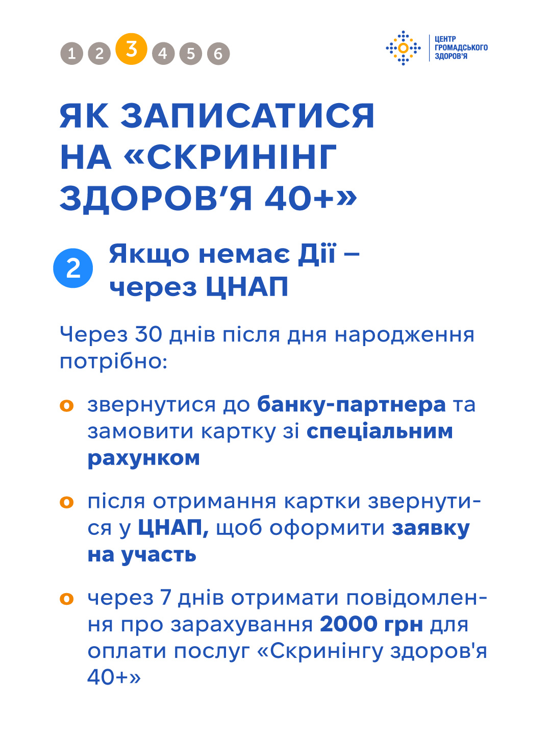 3. За 7 днів після прийняття запрошення та відкриття картки на Дія.Картку надійде 2000 гривень, які можна витратити тільки на «Скринінг здоров’я 40+».