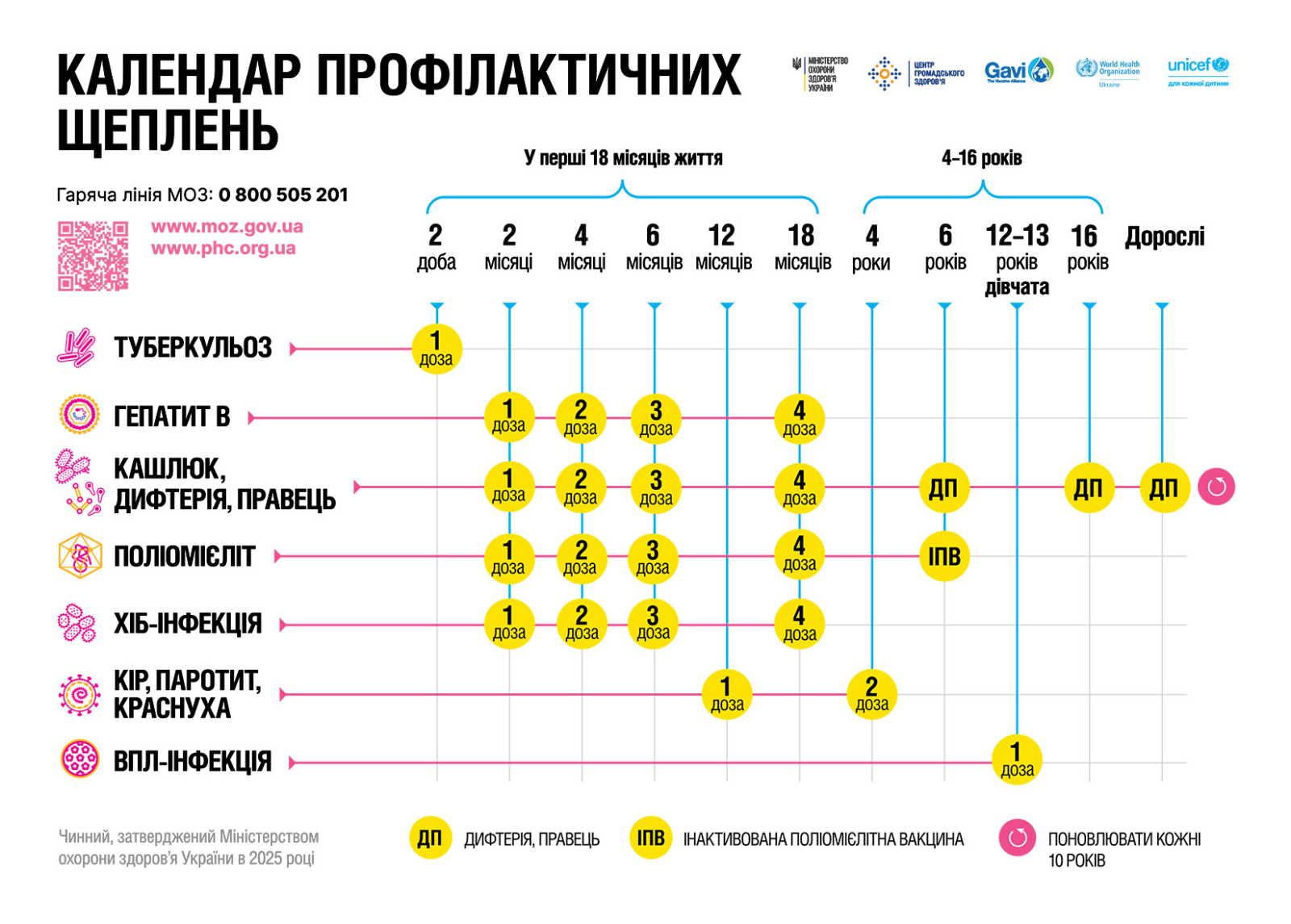 Оновлений Календар профілактичних щеплень з 1 січня 2026 року охоплюватиме обов’язкову вакцинацію проти 11 інфекційних захворювань: туберкульоз, гепатит В, кір, паротит, краснуха, поліомієліт, дифтерія, правець, кашлюк, ХІБ-інфекція та вірус папіломи людини (ВПЛ).