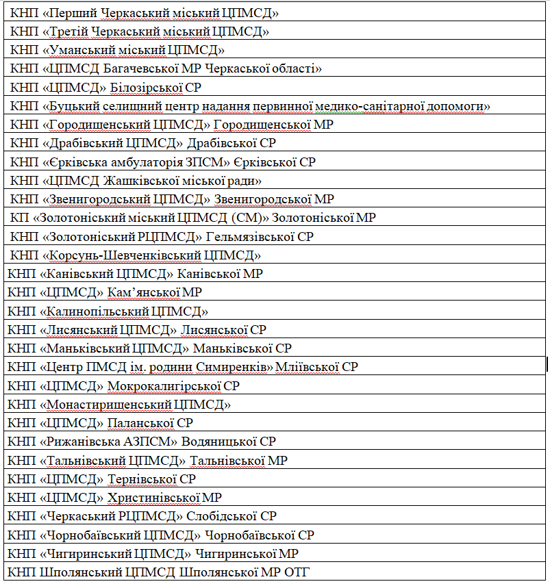 Заклади охорони здоров’я Черкаської області, у яких наявна вакцина від COVID-19 станом на 11.09.2025 року