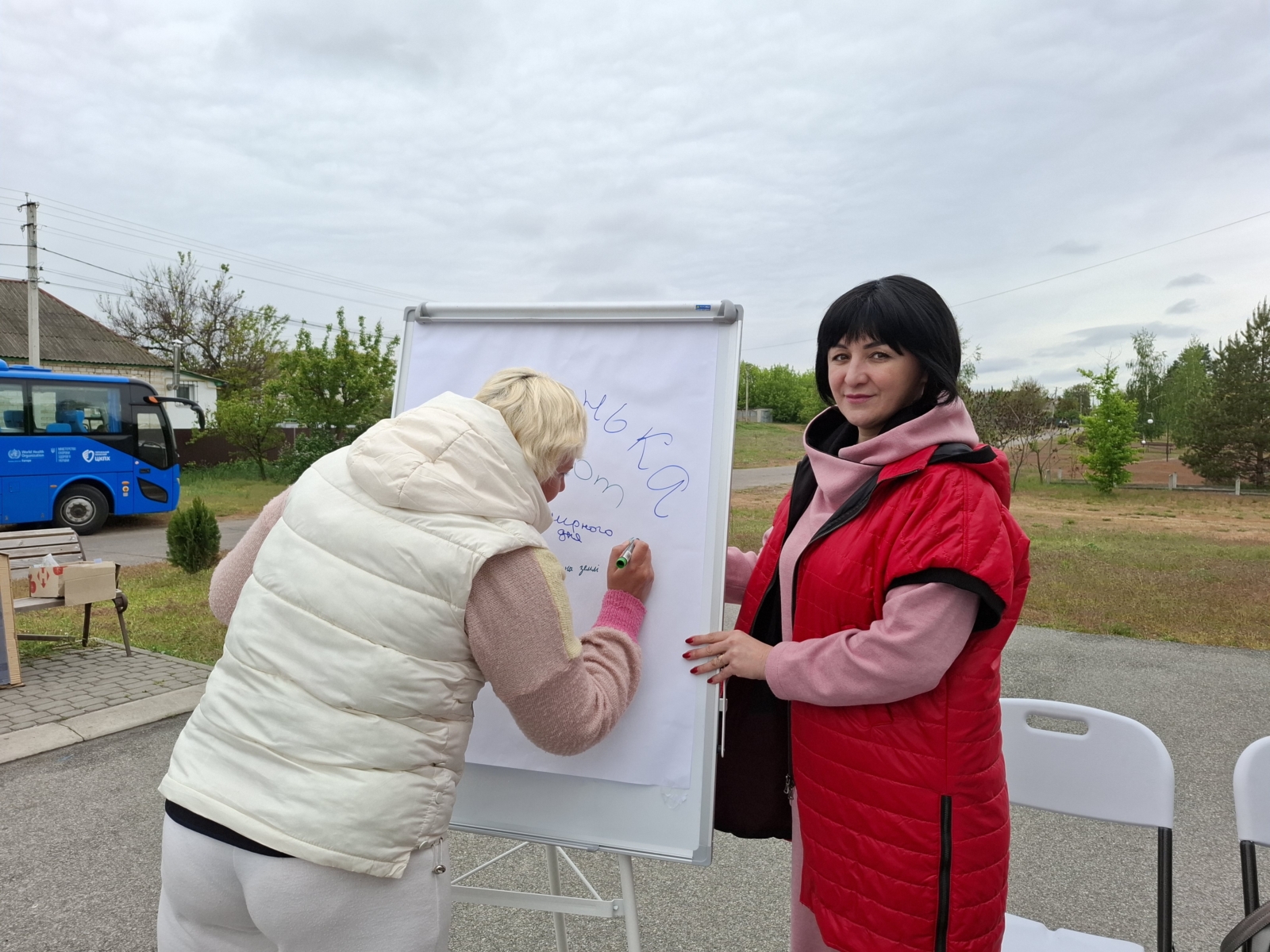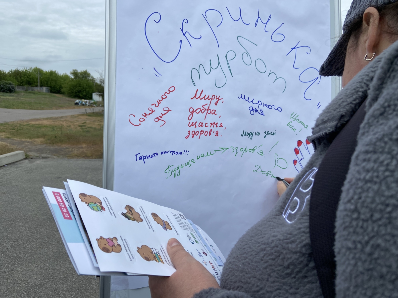 - поспілкуватися до та після вакцинації з психологинею Наталією Жуковською, яка залучала учасників до ментальної «Скриньки турбот»: кожен міг залишити теплі побажання на маркерній дошці для інших та обрати для себе приємні слова чи фразу дня;