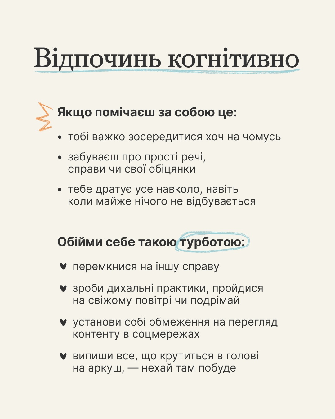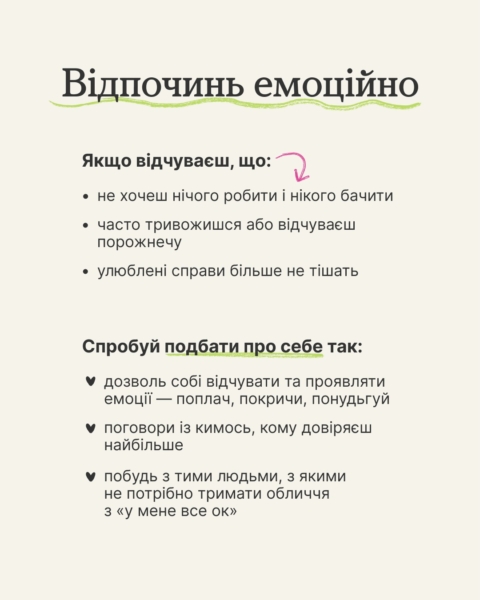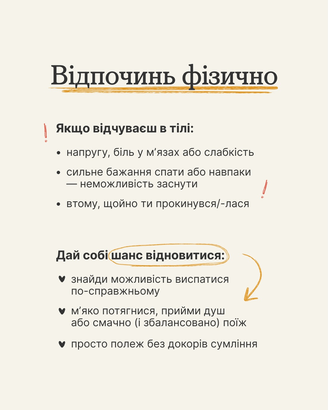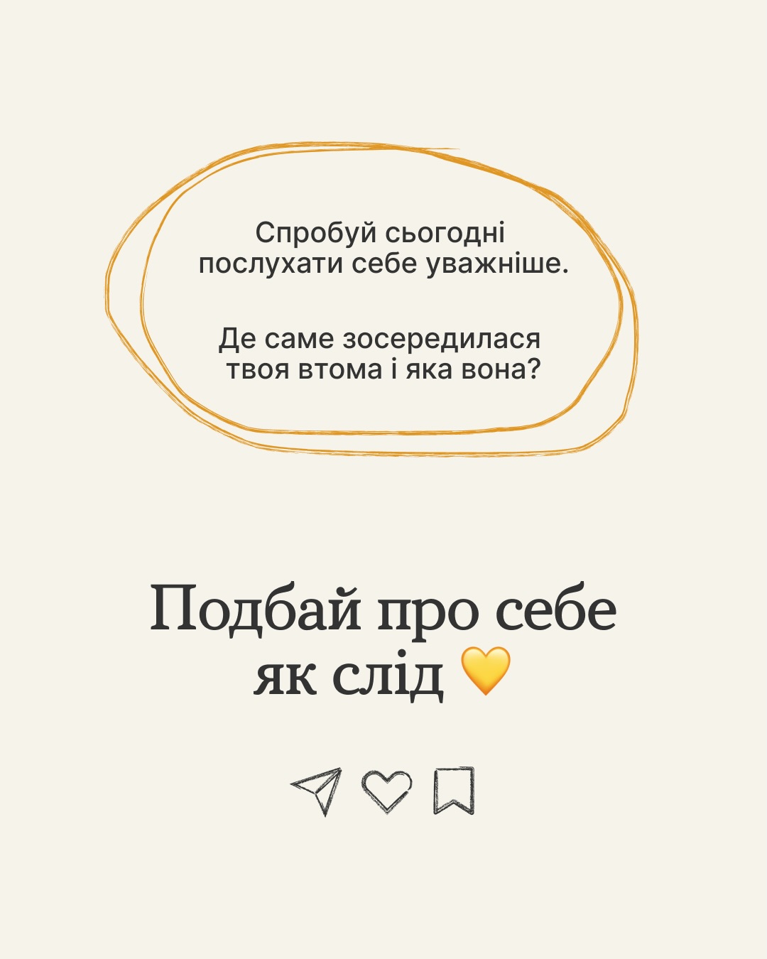 У каруселі знайдеш три типи втоми й прості способи, як відновитися по-справжньому. Комбінуй їх, якщо потрібно, і не забувай дбати про себе. Домовились?